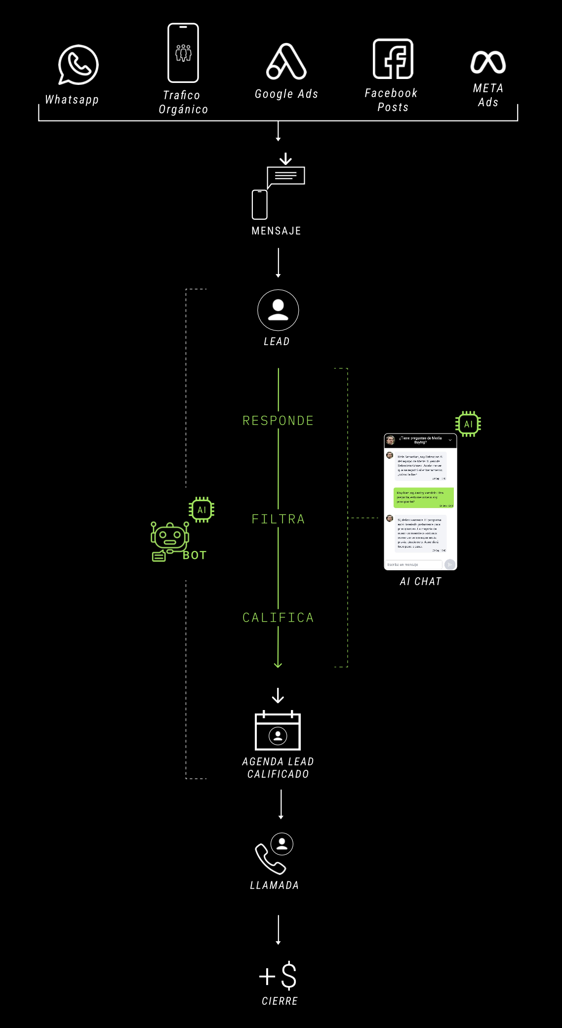 Su AI Bot responde, califica y agenda citas y llamadas automáticamente — sin que usted tenga que hacerlo.