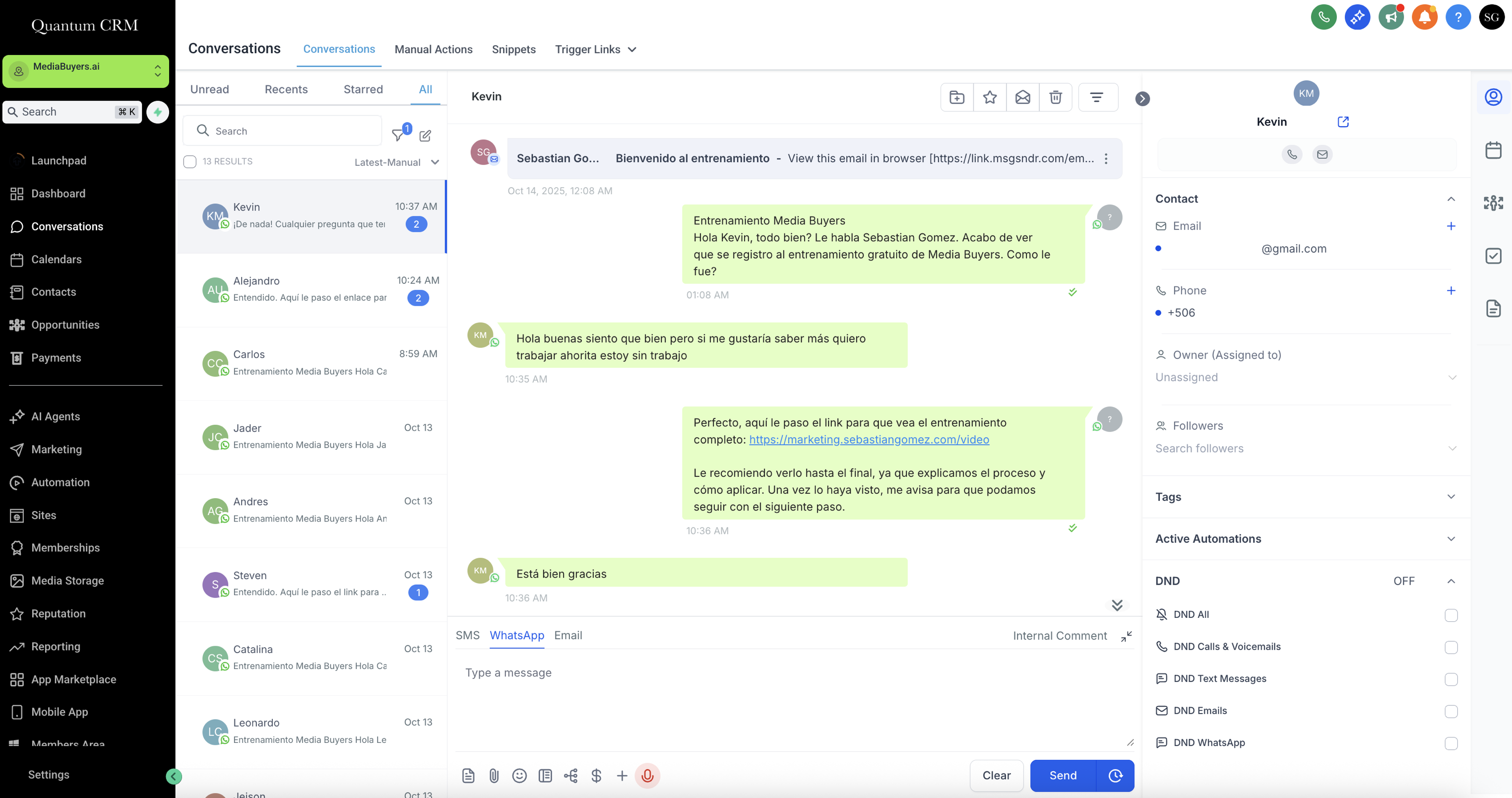 El AI Bot automatiza gran parte del proceso de respuesta y seguimiento. Puede manejar conversaciones iniciales, calificar leads y agendar citas, reduciendo la necesidad de responder manualmente.